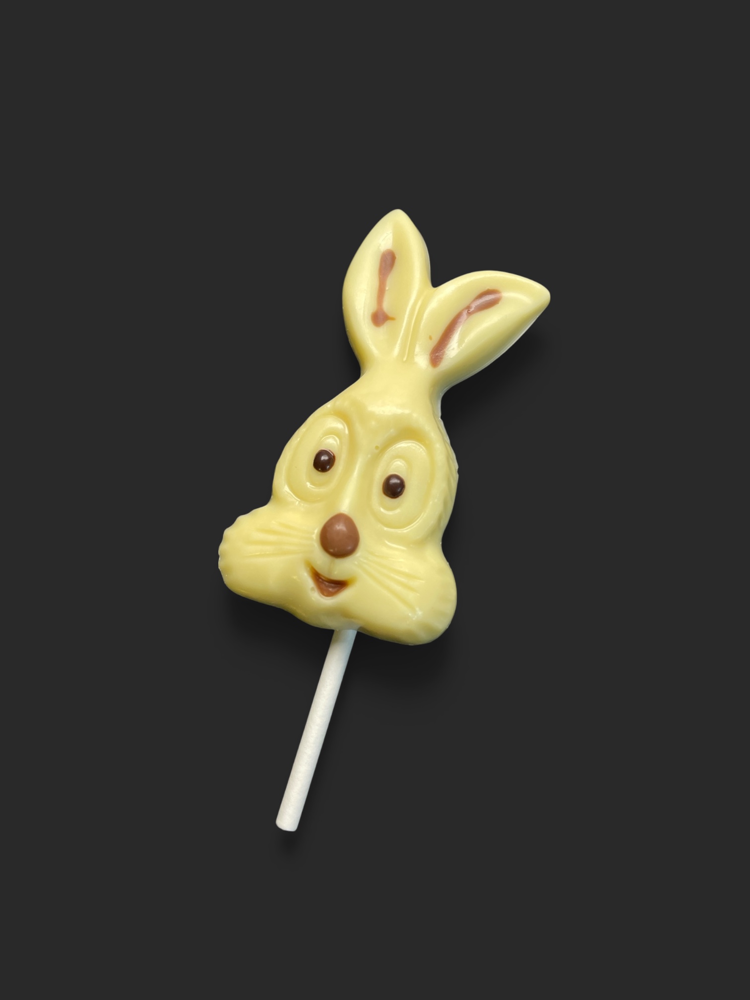Handgefertigte, österliche Schokoladen-Lutscher, liebevoll bemalt mit verschiedenen Kuvertüren und gegossen aus feinster Edelweiß-Schokolade (36% Kakaoanteil mindestens).