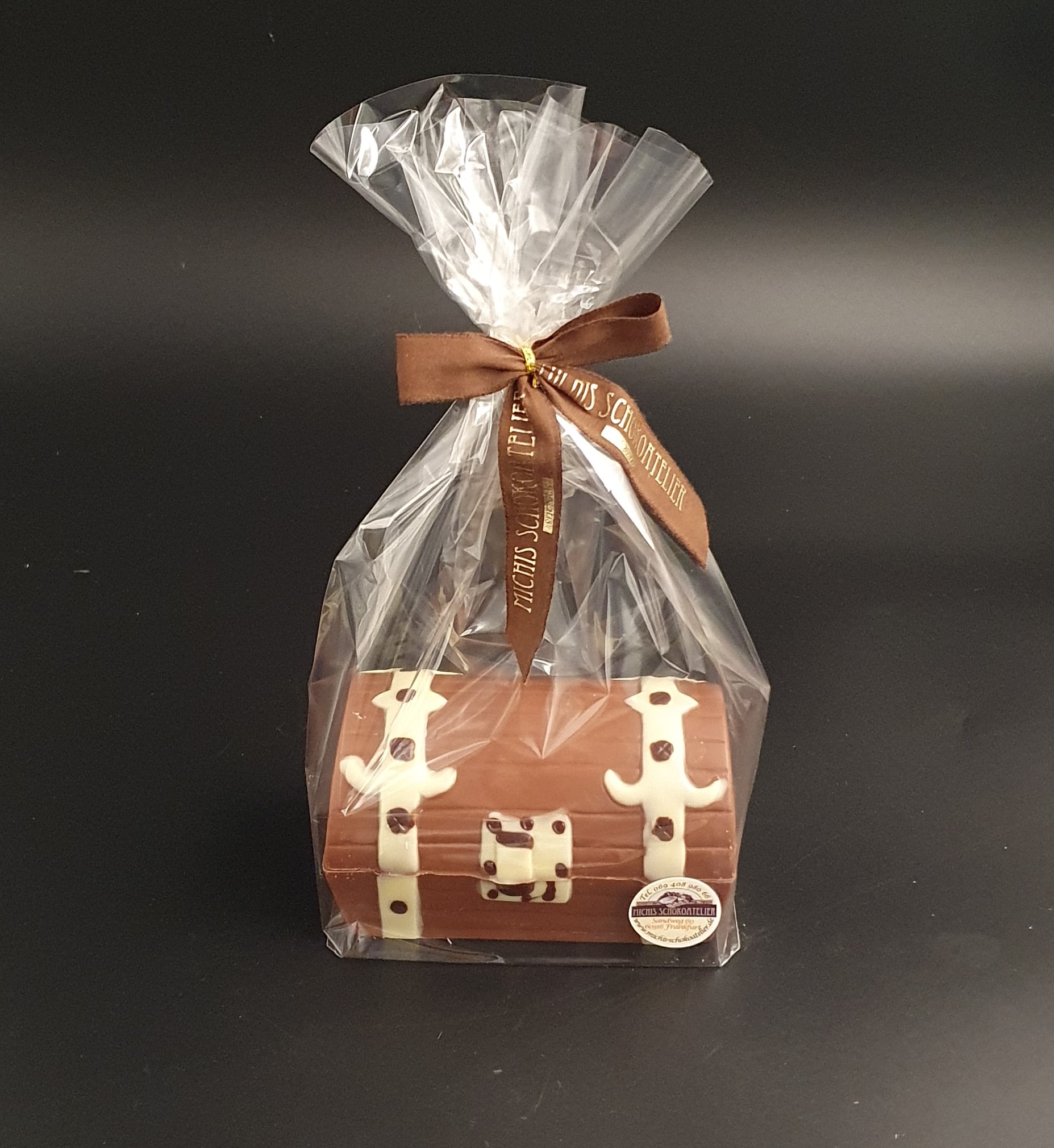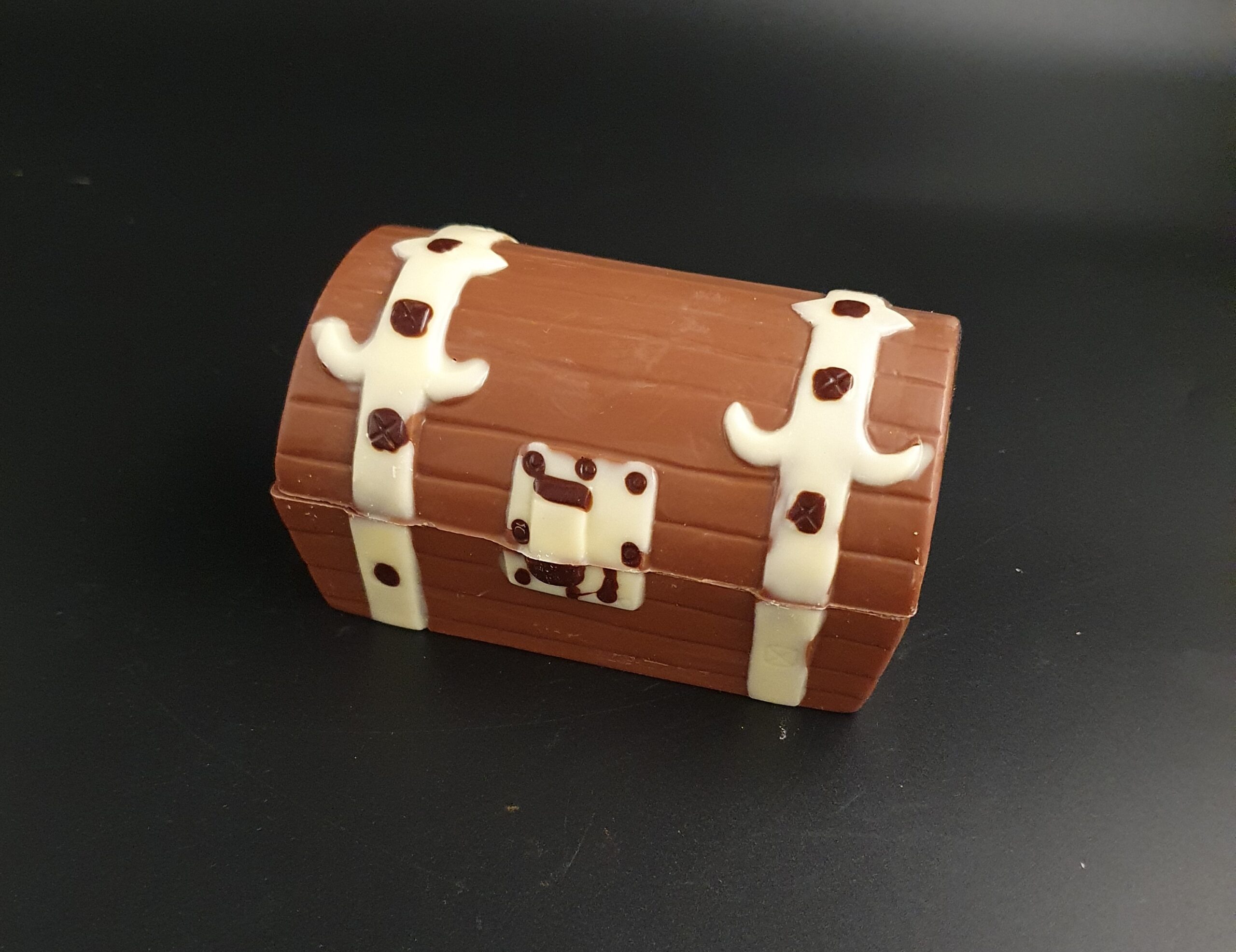 Handgefertigte Schatztruhe, mit viel Liebe ausdekoriert und gegossen aus feinster costa-ricanischer Vollmilch-Schokolade (40% Kakaoanteil mindestens). Sie kann wahlweise mit 5-8 Pralinen befüllt werden (je nach Größe).