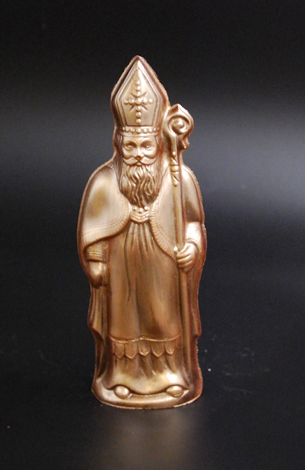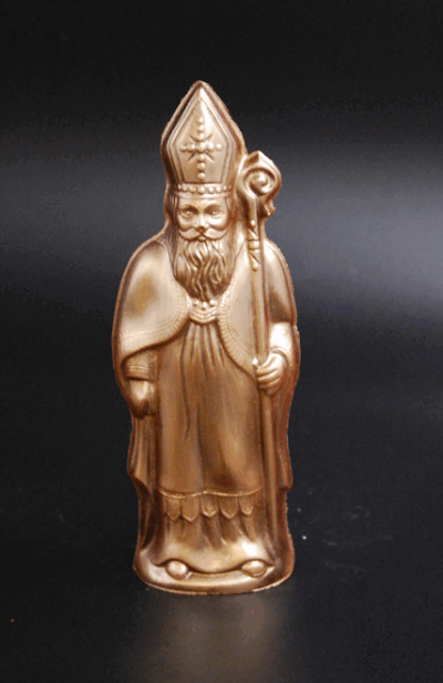 Handgefertigter Bischof, mit viel Liebe ausdekoriert und gegossen aus feinster zartbitterer Maracaibo-Schokolade (65% Kakaoanteil mindestens).