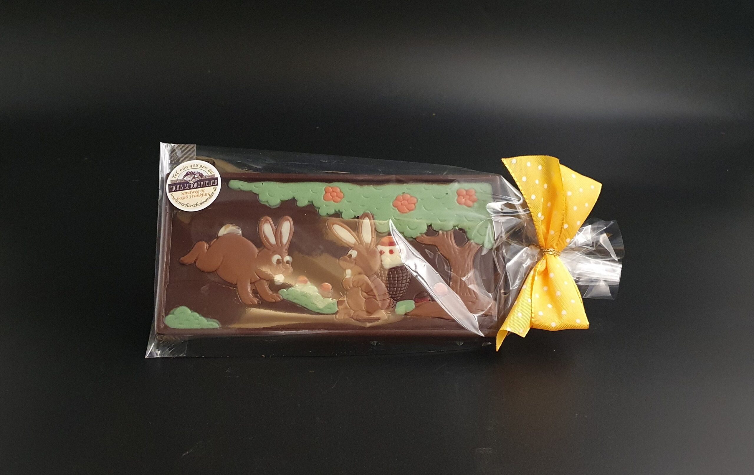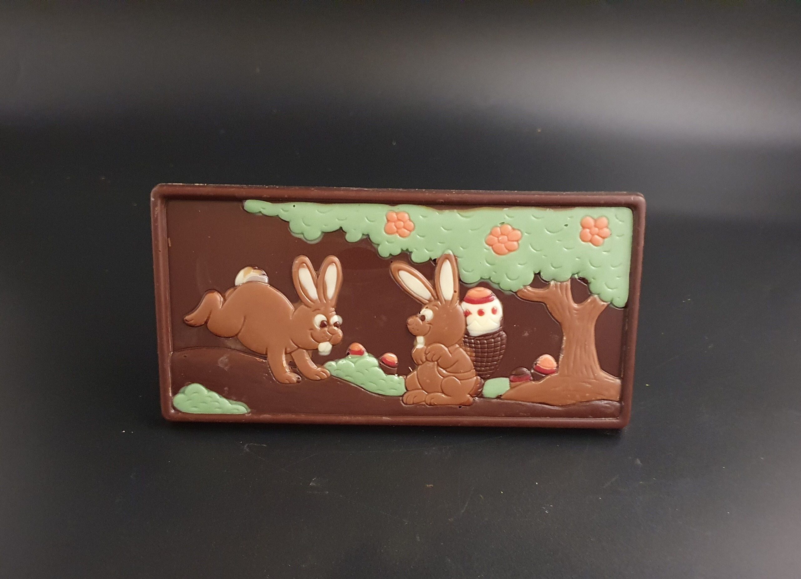 Handgefertigte Schokoladentafel mit Oster-Motiv, liebevoll ausdekoriert mit bunt gefärbter Kuvertüre und gegossen aus feinster costa-ricanischer Vollmilch-Schokolade (40% Kakaoanteil mindestens).