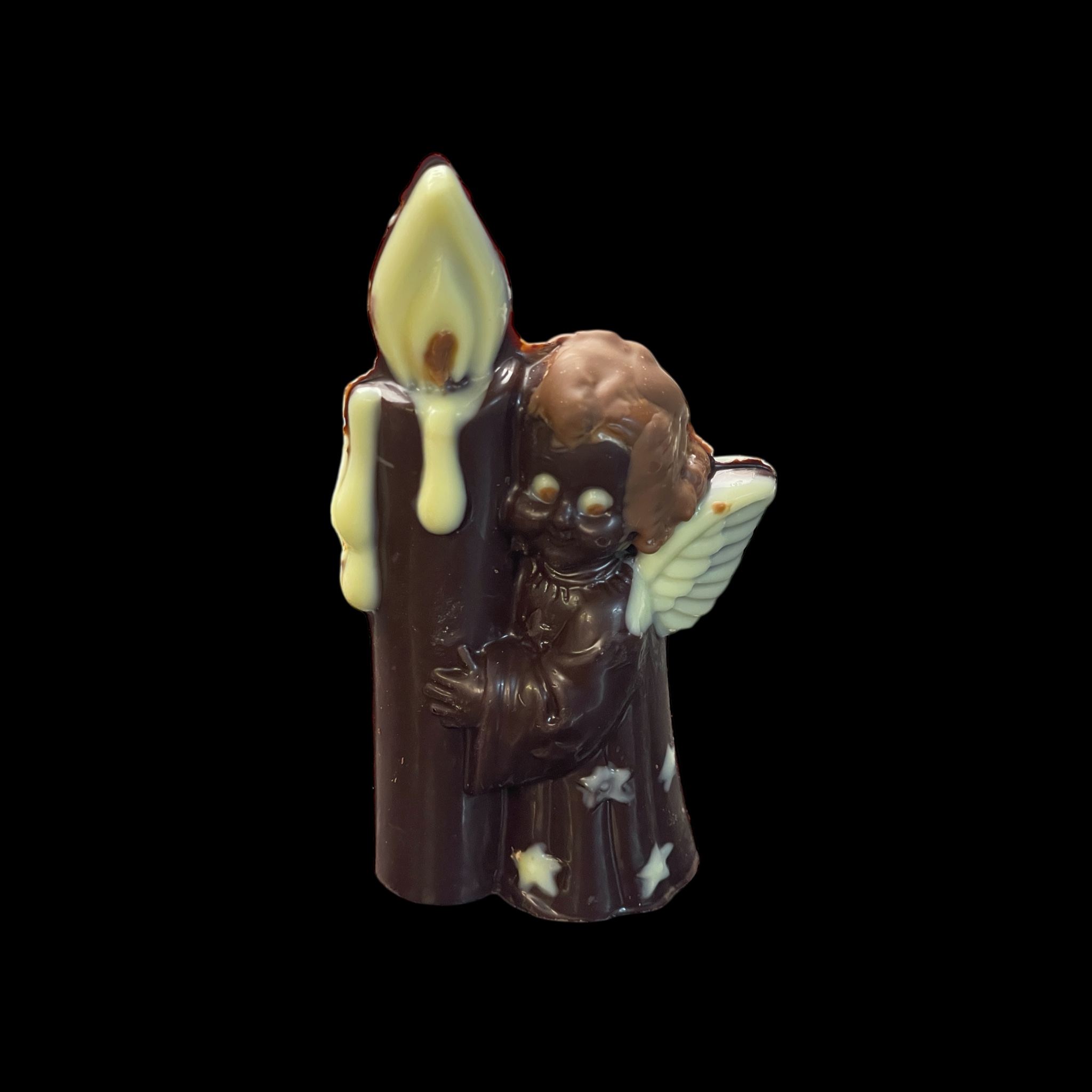 Handgefertigter Schoko-Engel, mit viel Liebe ausdekoriert und gegossen aus feinster Schokolade (zur Auswahl stehen costa-ricanische Vollmilch-Kuvertüre oder zartbittere Maracaibo-Kuvertüre).