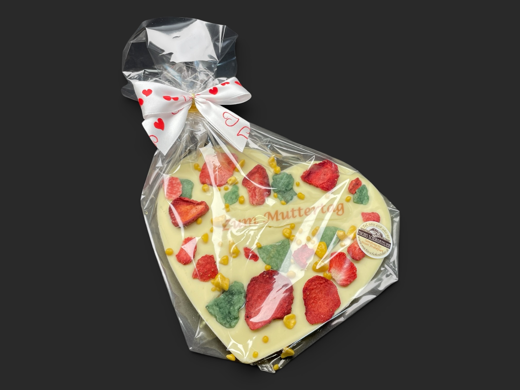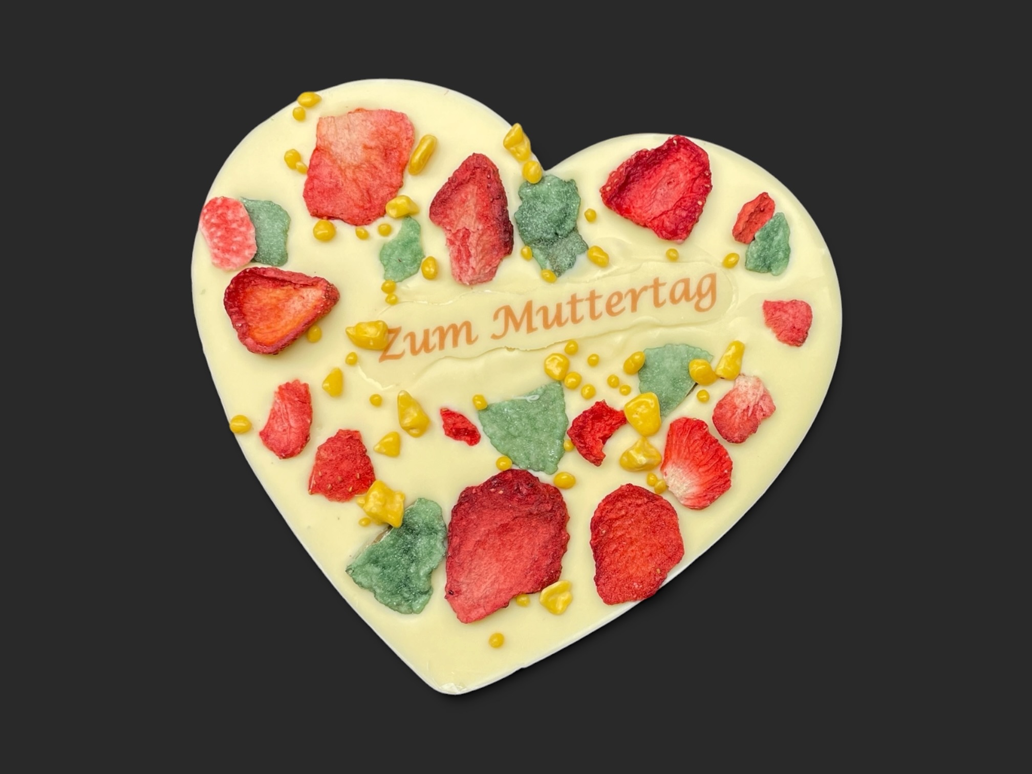 Jedes Schokoladenherz Muttertag entsteht in Michis Schokoatelier in liebevoller Handarbeit. Wir gießen die zarte Vollmilchschokolade in eine Herzform, lassen sie behutsam auskühlen und dekorieren das flache Schokoherz Muttertag anschließend mit feinen Akzenten aus Erdbeere, Passionsfrucht und einem Hauch Minze.