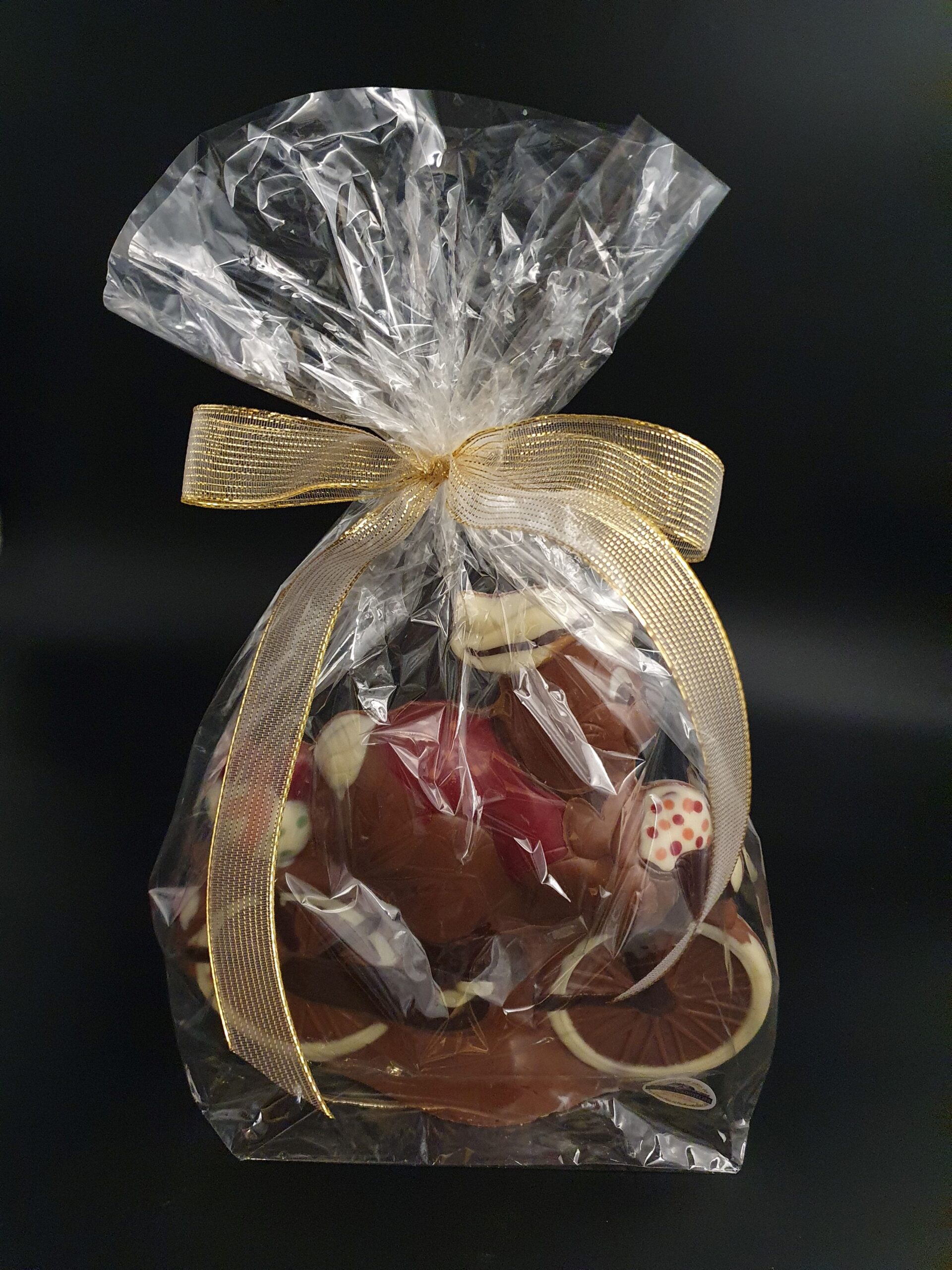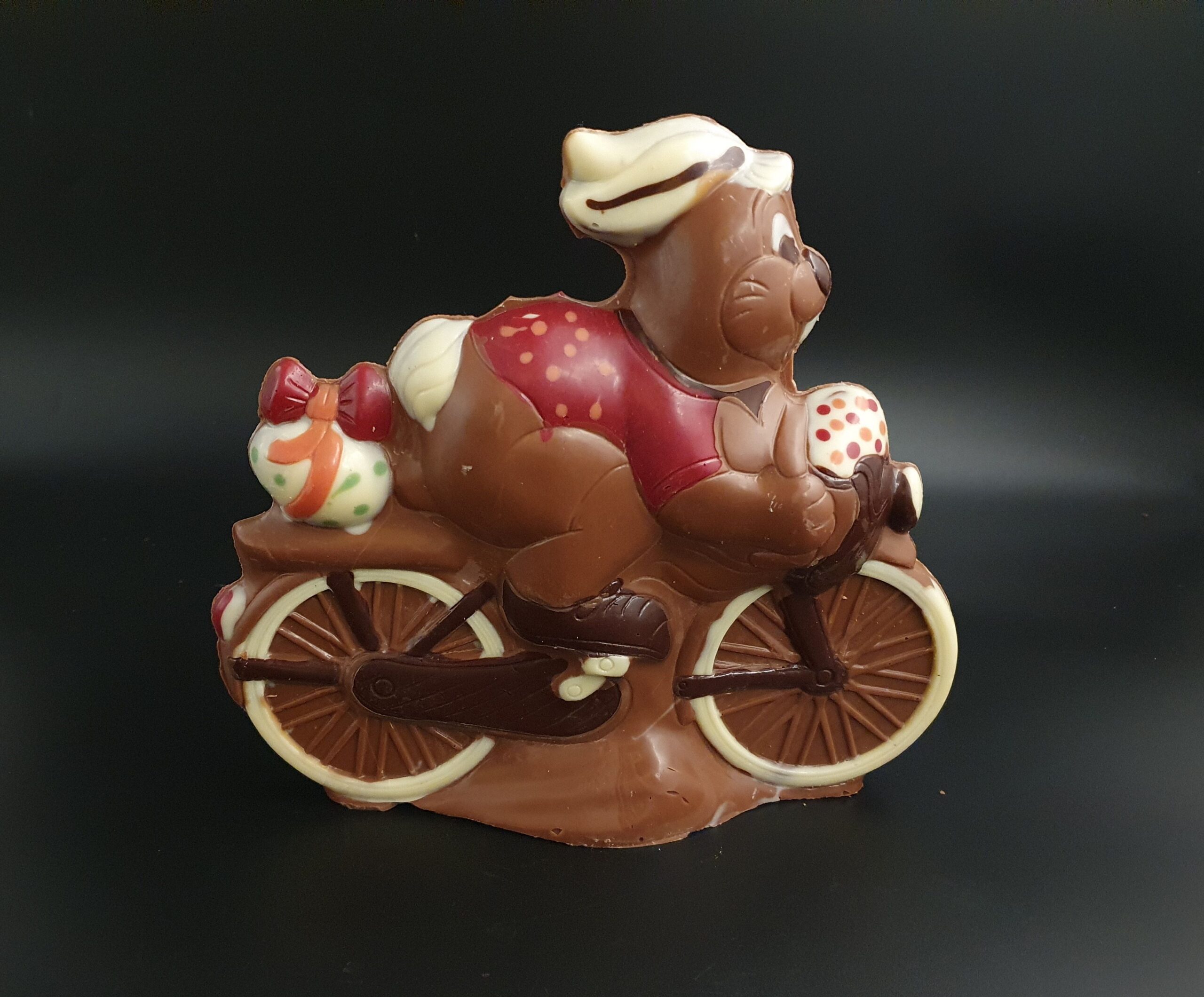 Handgefertigter Schokoladen-Osterhase auf dem Fahrrad, liebevoll ausdekoriert mit bunt gefärbter Kuvertüre und gegossen aus feinster costa-ricanischer Vollmilch-Schokolade (40% Kakaoanteil mindestens).