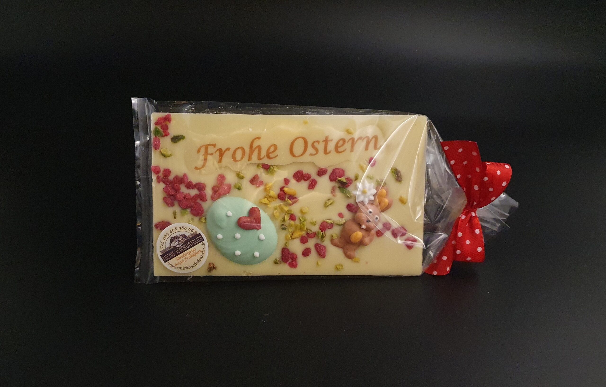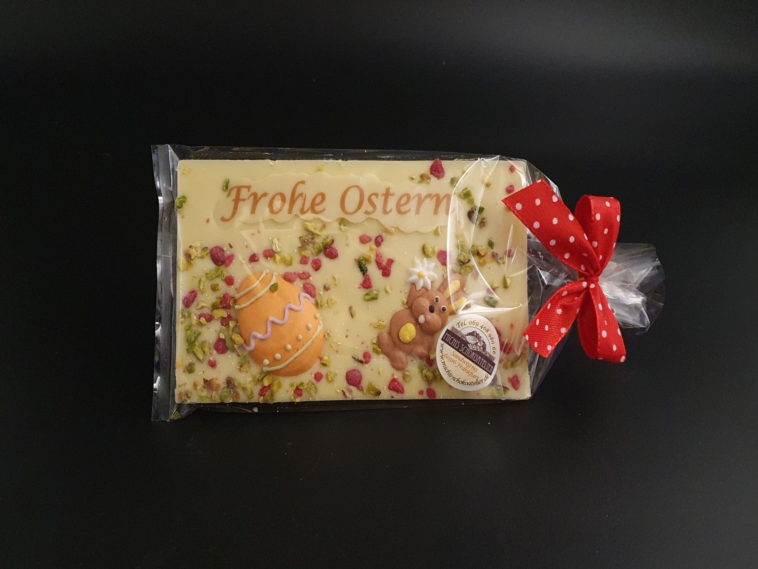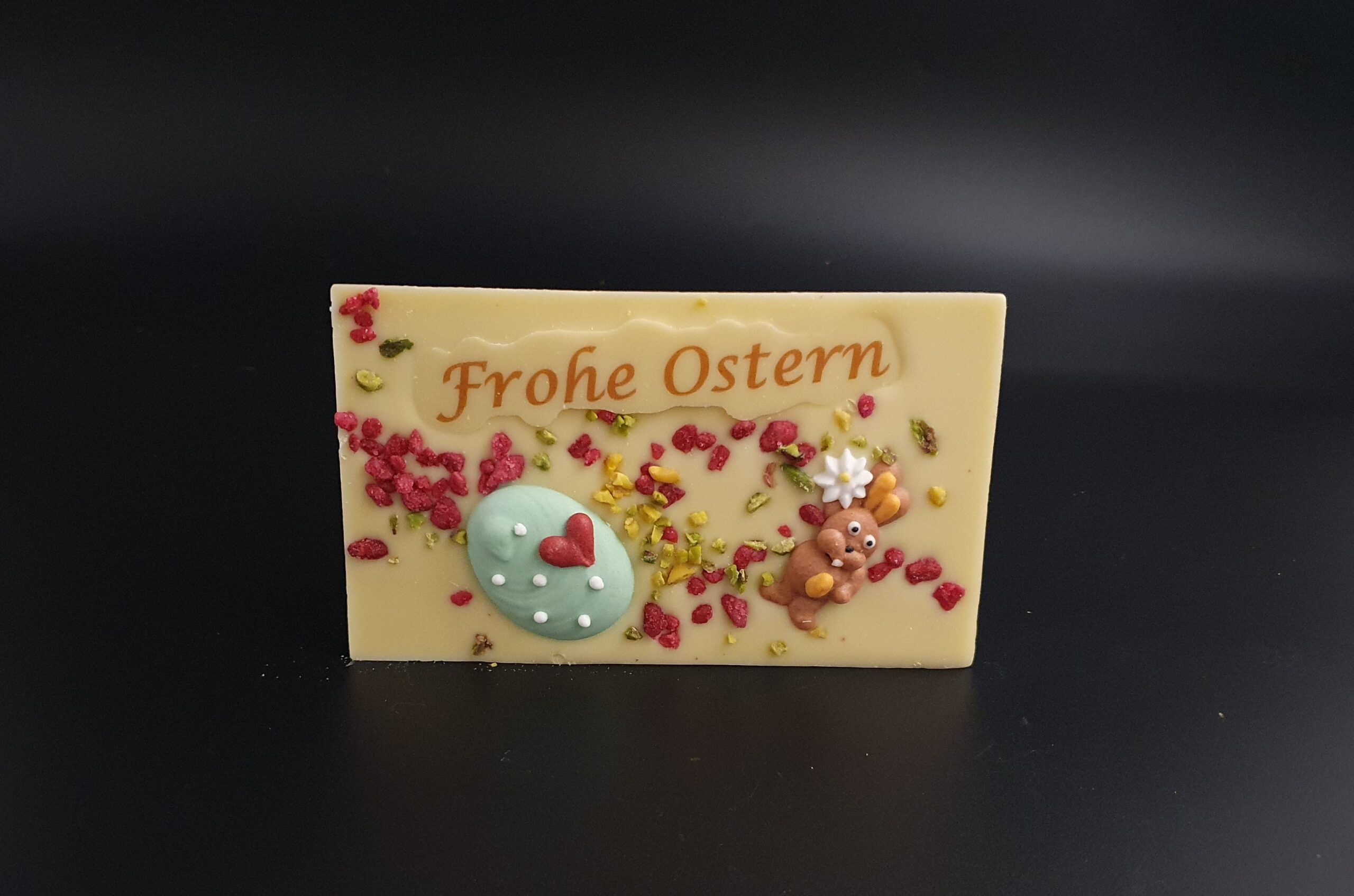 Handgefertigte Schokoladentafel, liebevoll verziert mit Oster-Gruß und -Dekor, gehackten Pistazien und kristallisierten Rosenblüten, gegossen aus feinster Edelweiß-Schokolade (36% Kakaoanteil mindestens).
