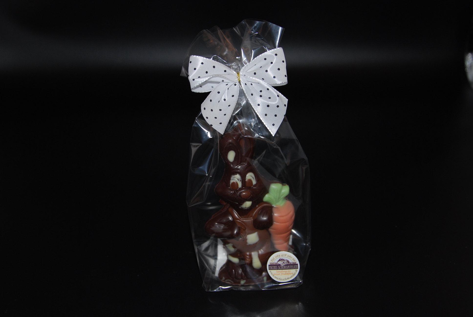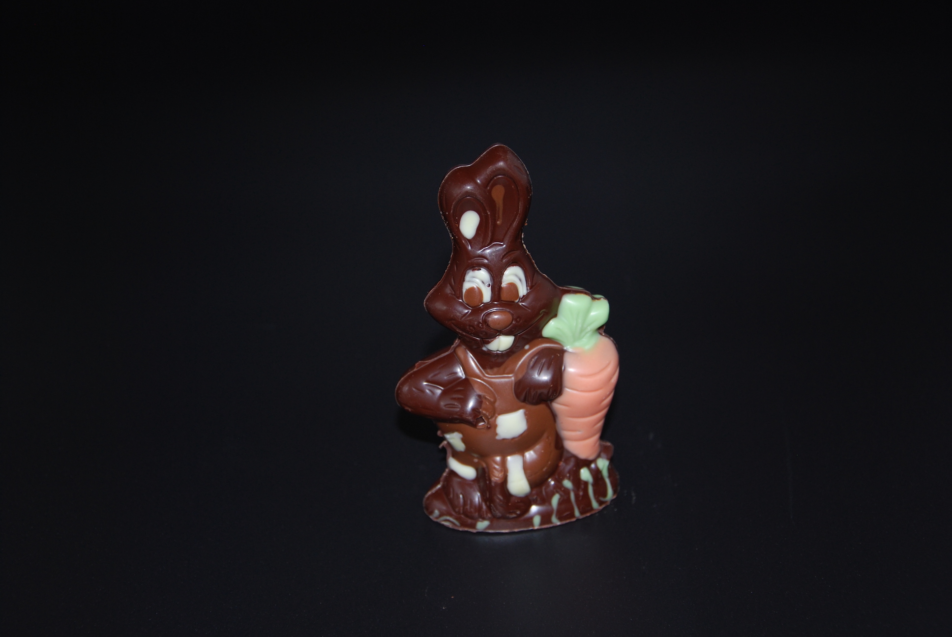 Handgefertigter Schokoladen-Osterhase mit Karotte, liebevoll ausdekoriert mit bunt gefärbter Kuvertüre und gegossen aus feinster Zartbitter-Schokolade (Maracaibo – Venezuela, 65% Kakaoanteil mindestens).