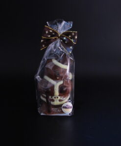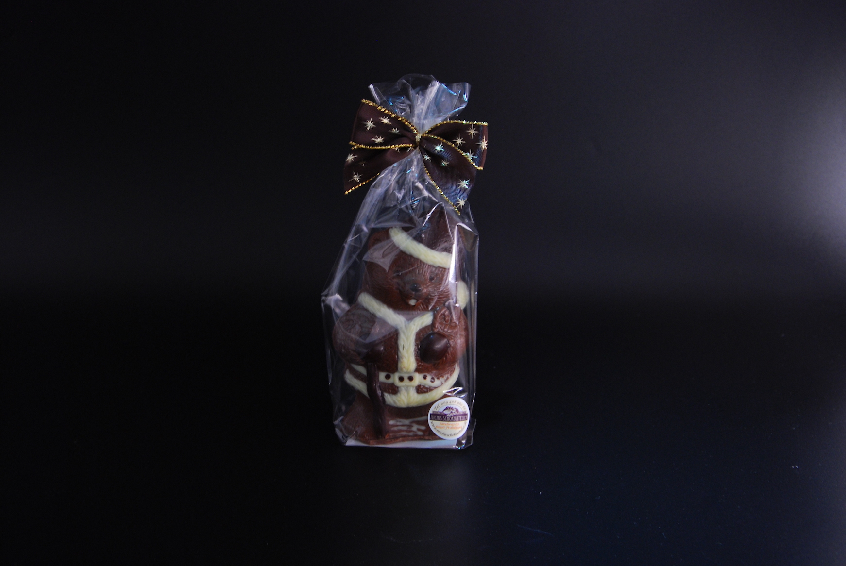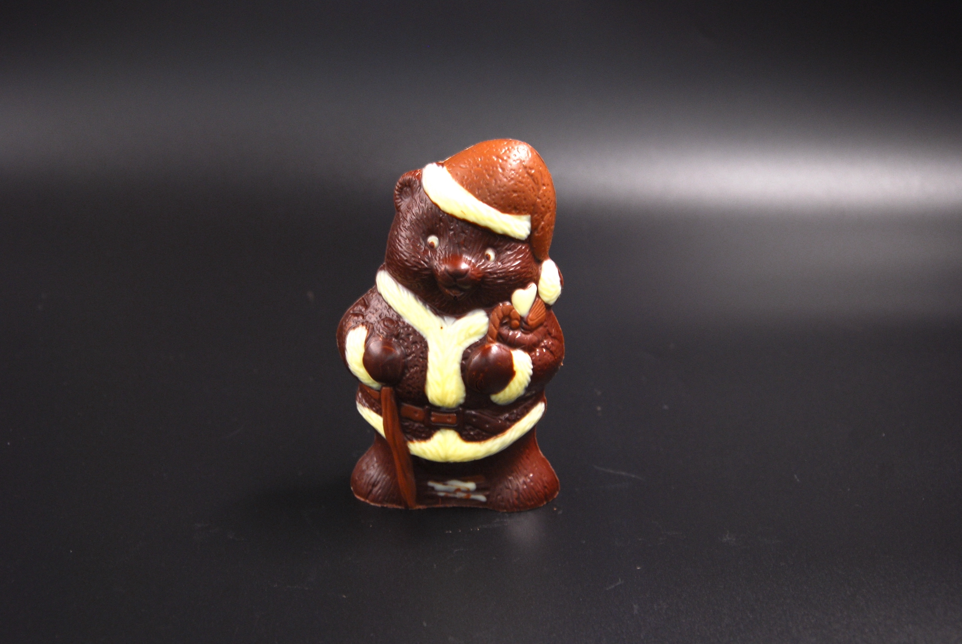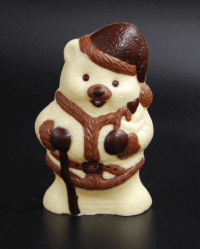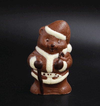 Handgefertigter weihnachtlicher Bär, mit viel Liebe ausdekoriert und gegossen aus feinster Schokolade (zur Auswahl stehen weiße Sao Palme-Schokolade, costa-ricanische Vollmilch-Schokolade oder zartbittere Maracaibo-Schokolade).