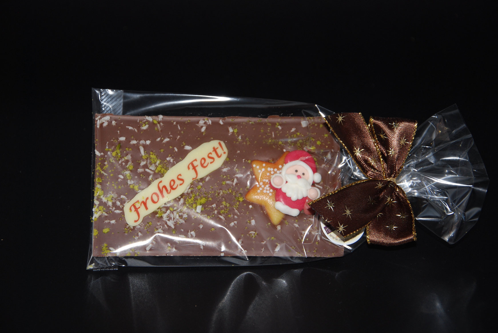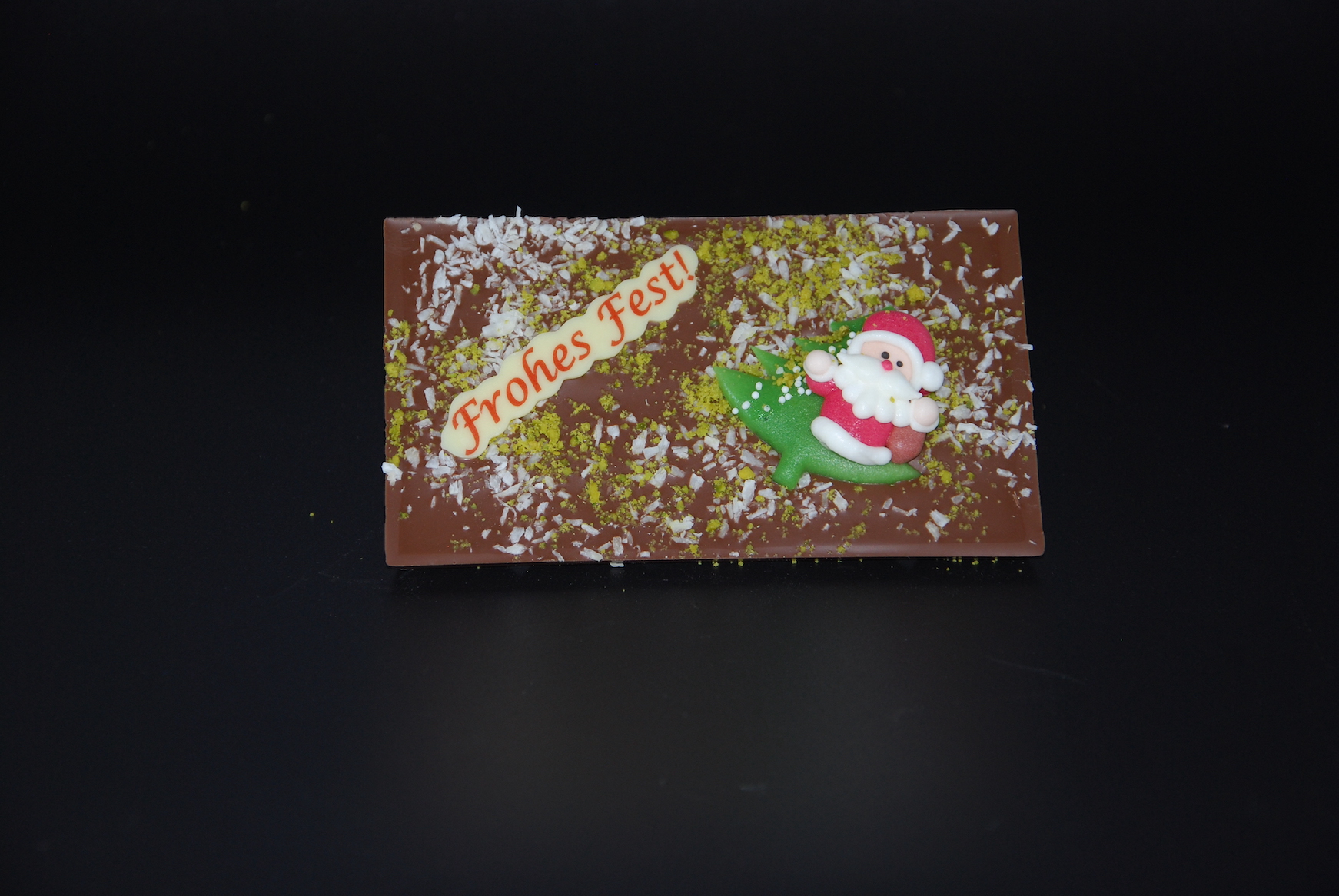 Handgefertigte Schokoladentafel, mit viel Liebe ausdekoriert und gegossen aus feinster Vollmilch-Schokolade (40% Kakaoanteil mindestens).